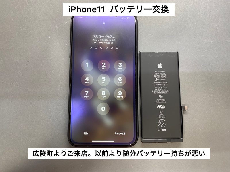 今回ご紹介の方は、磯城郡広陵町からご来店下さいました。3年近く使用しているiPhone 11のようで、最大容量が86%になってらっしゃる状態。朝に100%で家を出て、1日のうちに何回か充電しないと持たないご様子。