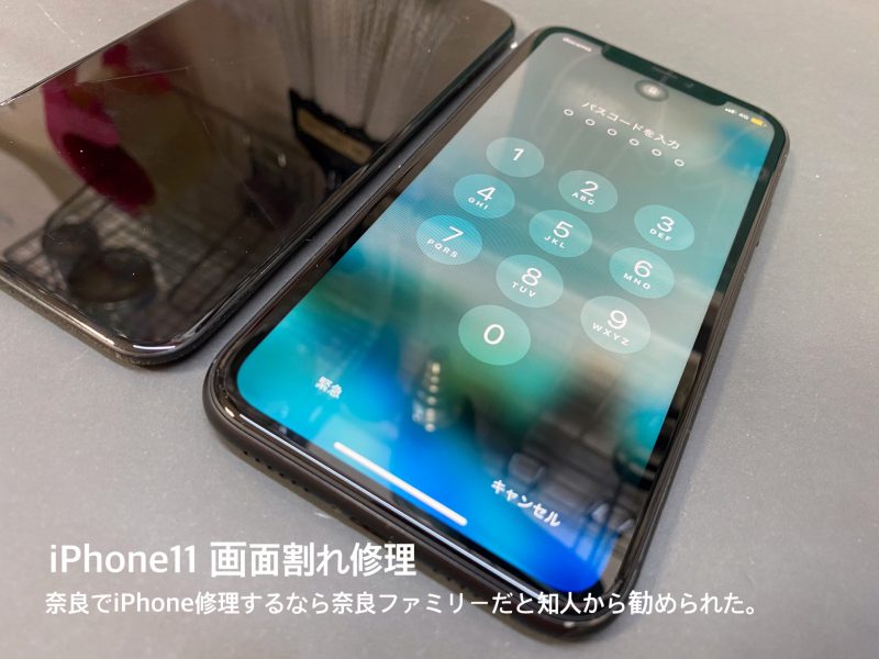 「スマホのガラスが割れてしまって、どこでiPhone修理しようかと知り合いに相談したら、奈良ファミリーの館内にあるカメラアサヒとい後iPhone修理店が丁寧で安いのでオススメだよと勧められて来ました。機種はiPhone11です。お願いします。」とご来店下さいました。