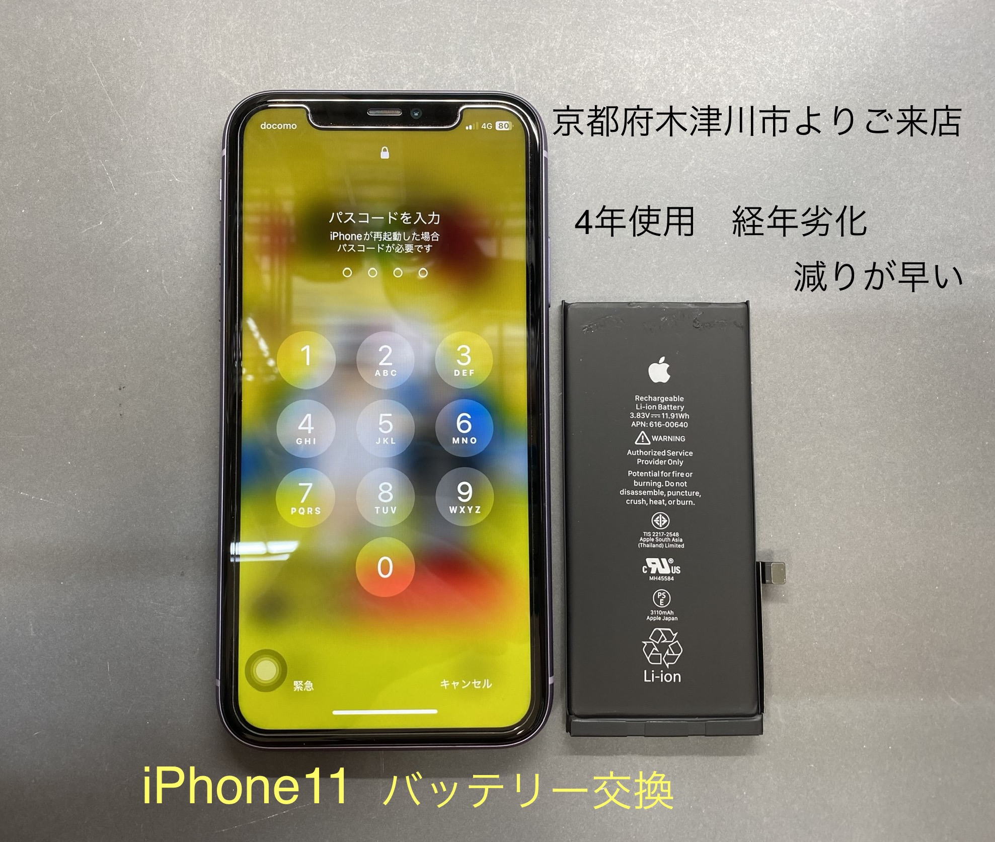 今、4年程使われているiPhone11のバッテリーの減りが早くなり、使いづらくなってきたとお話しを伺いました。