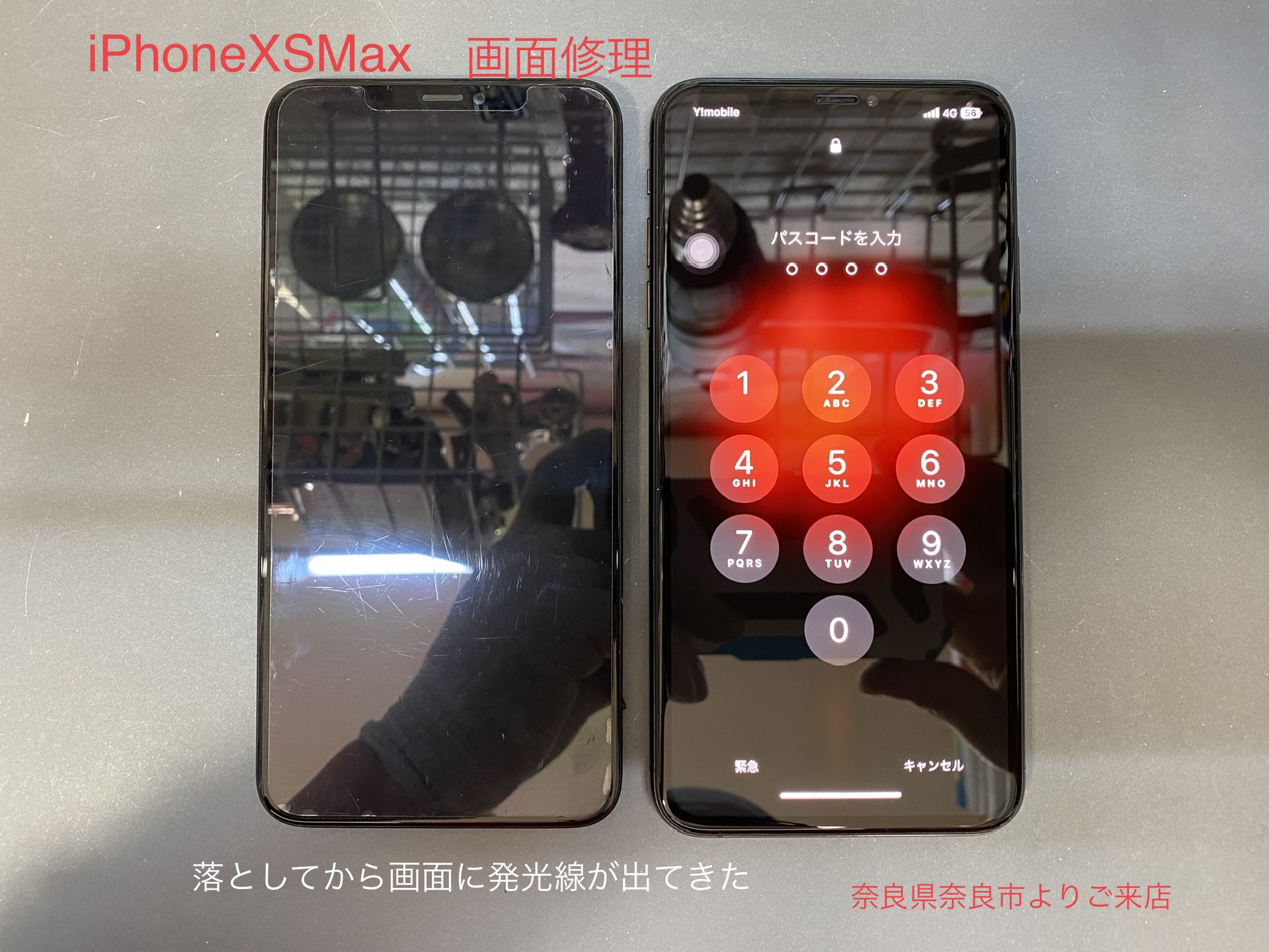 「落としてから画面に発光線が出てきた、今のところ使うのには問題ないが不具合ぎ出る前に修理しておきたい」と伺いましたのは、奈良県奈良市よりお越し下さいました、iPhoneXSMaxの画面修理のご依頼です。
