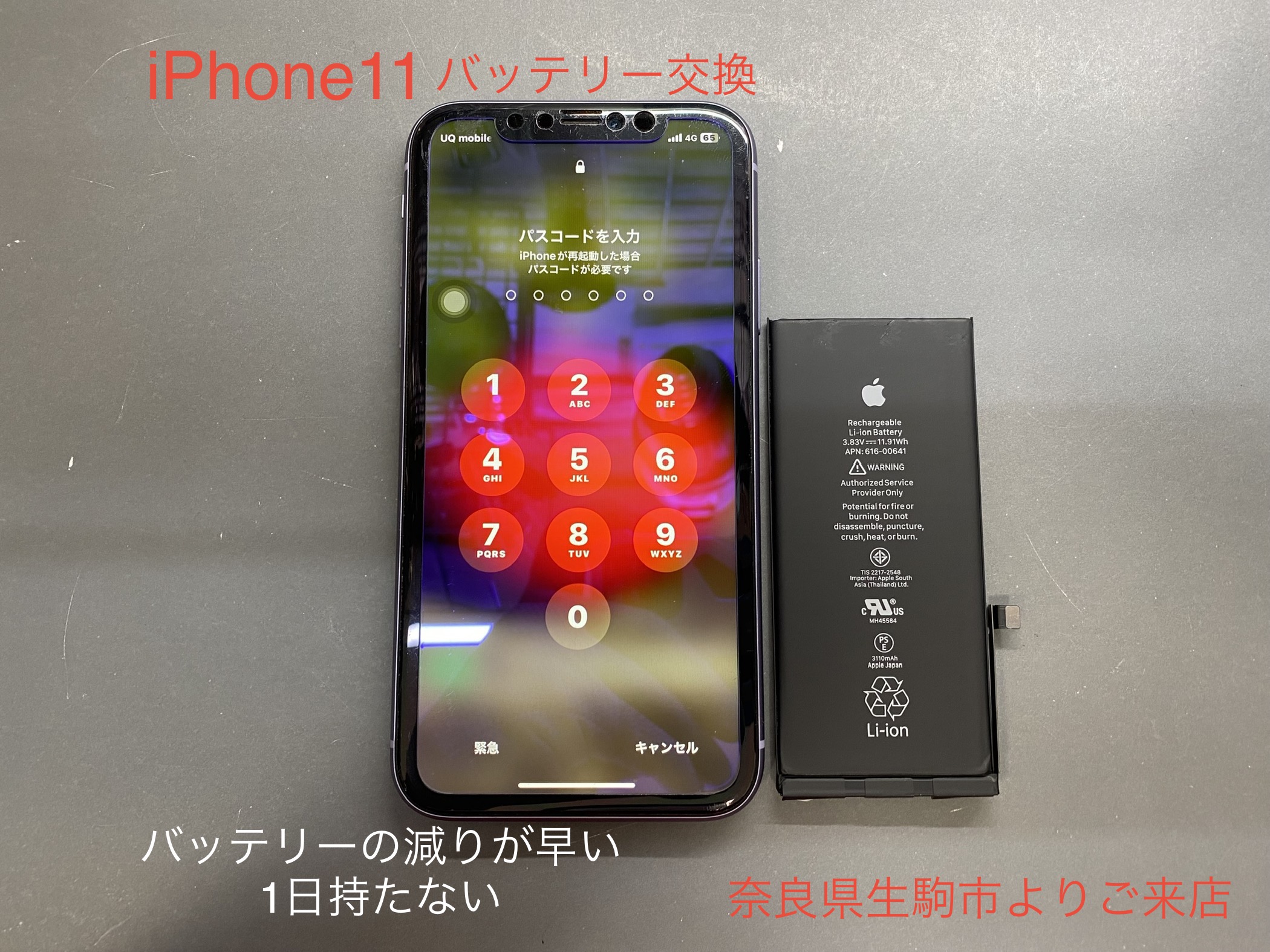 「iPhone11のバッテリーの減りが早くなってきて1日持たなくなってきた」とお話しして下さいましたのは、インターネットでiPhone修理店をお調べになり奈良県生駒市よりご来店頂きましたお客様です。
