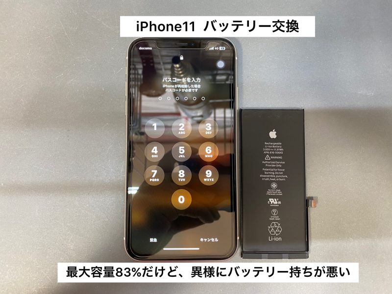 今回のお客様は、奈良市帝塚山からご来店下さいました。もう4年も使用されたiPhone 11のようで、最大容量が83%だけど、もっと悪い気がする。もう劣化してますと言ったメッセージも出ているとご来店下さいました。
