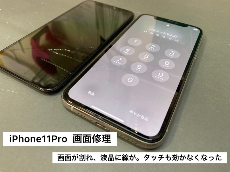 今回のお客様は、奈良 橿原市からご来店。iPhone11 Proの画面修理でらっしゃいました。落下させて画面が割れ、液晶が線だらけに。タッチも効かない状態になってしまったとご来店。