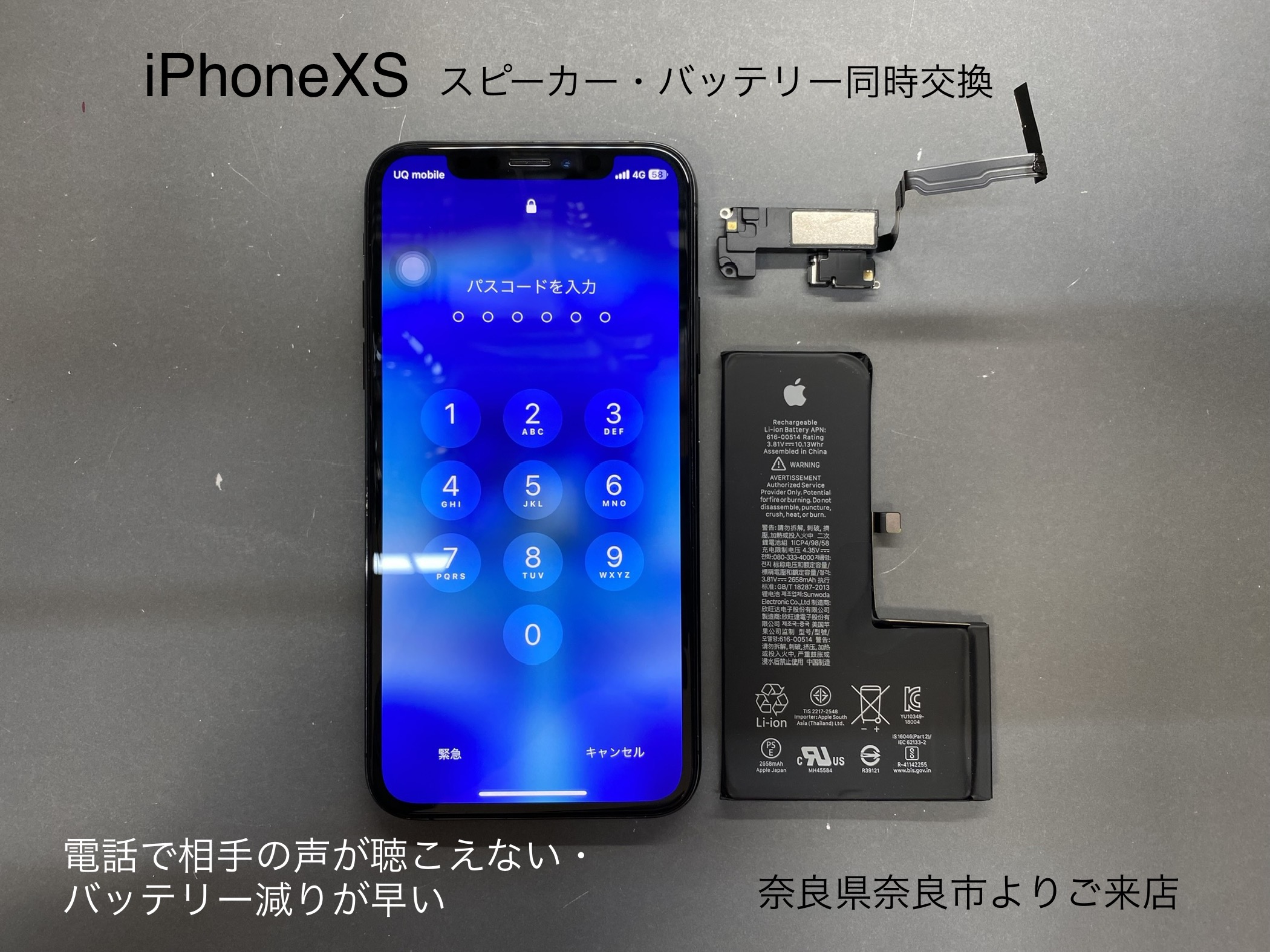 iPhoneXSのイヤースピーカーから電話での相手の声が聴こえない、自分の声は相手に聴こえている、バッテリーもかなり消耗しているので一緒に交換して欲しいとご依頼を頂きました。