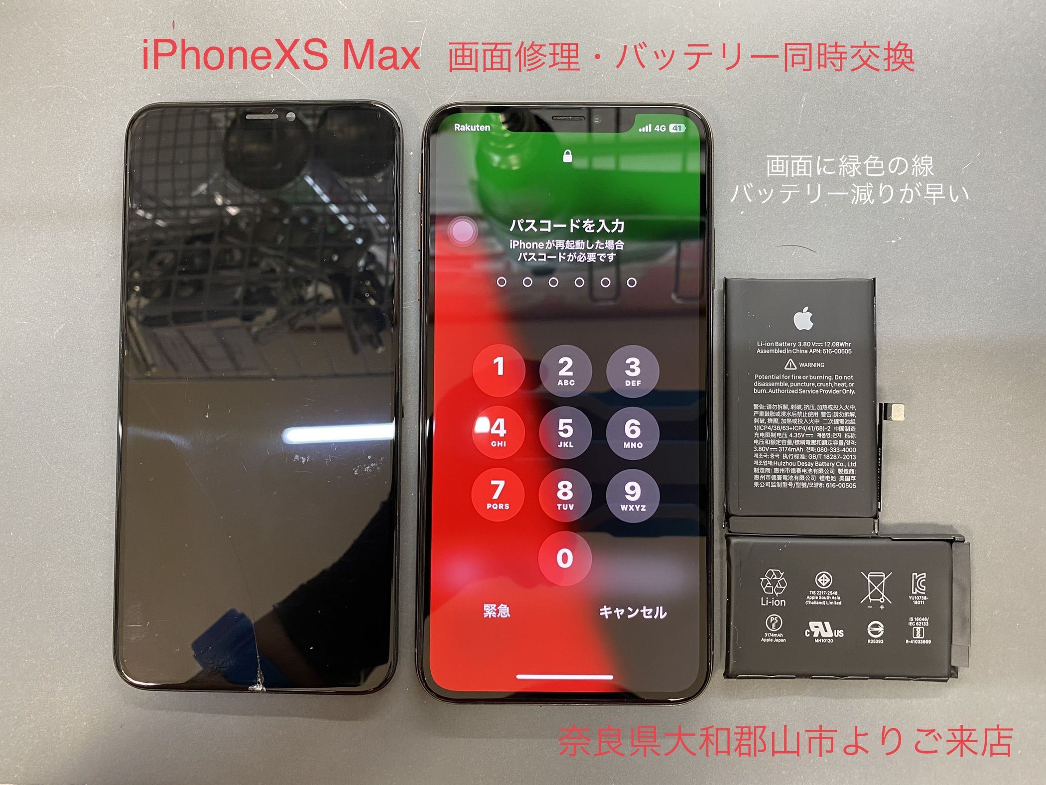 『iPhoneXSMaxの画面、中央縦に緑色の線が出てきた、今は問題無く使えているがバッテリーも消耗しているので一緒に交換して欲しい』とお話しを伺いました。