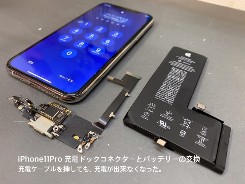 本日のアイフォン修理は、iPhone11Proの充電ドックコネクター交換修理と、バッテリー交換修理です。