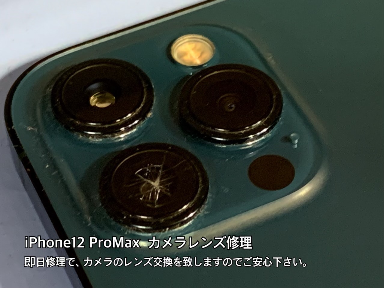 本日ご来店下さいましたお客様も「写真を撮る時に白くもやがかかったようになったので、確認するとレンズが割れていた。」とお困りのご様子でしたが、その日のうちにiPhone12Pro Maxのカメラレンズ修理は完了致しております。