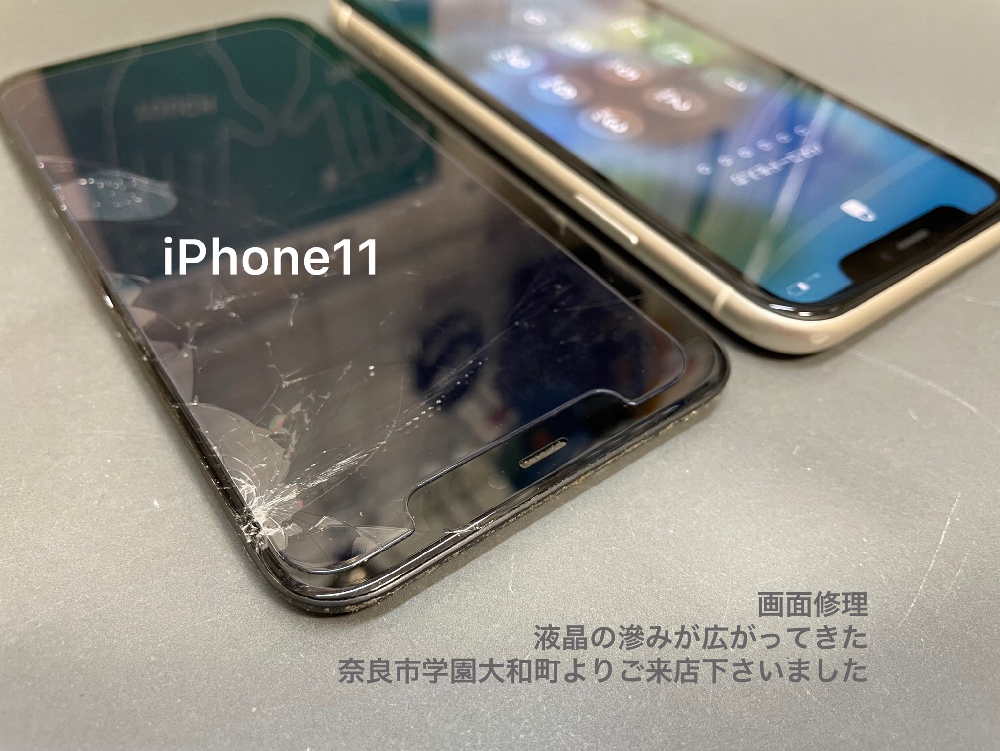 iPhone11の画面割れ・液晶漏れで、奈良県奈良市内よりご来店下さいました。
