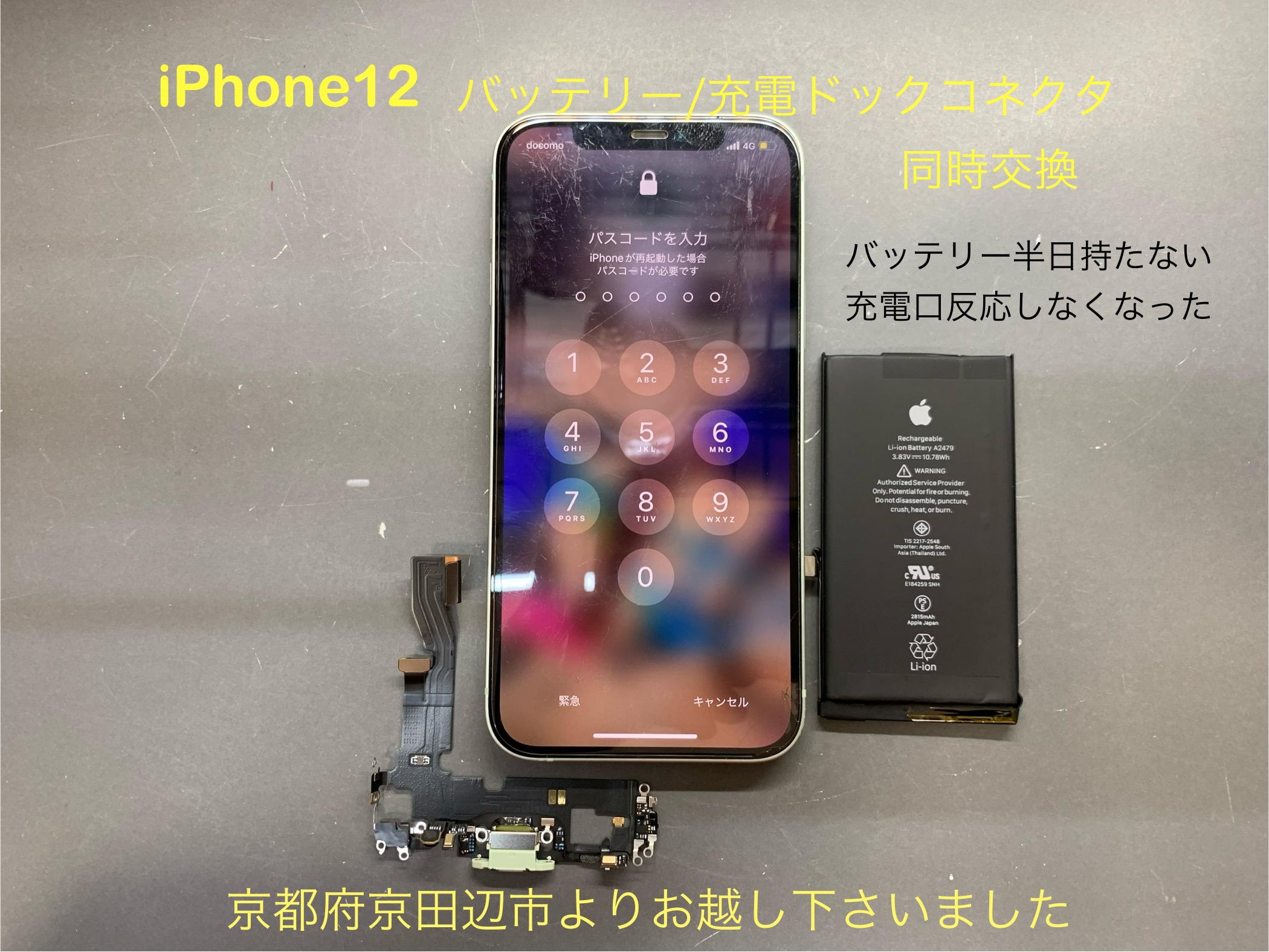 今回ご紹介させて頂きますiPhone 修理は京都府京田辺市からお越しのお客様よりiPhone 12のバッテリーと充電口(ドックコネクタ)な同時に交換のご依頼を頂きました。