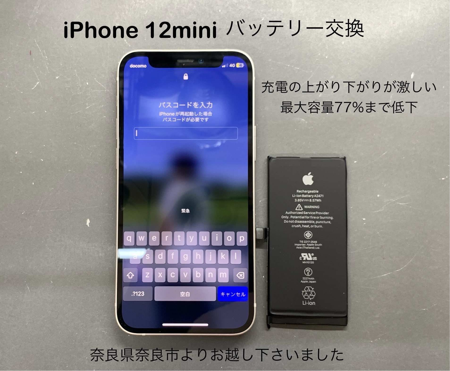 今回ご紹介させて頂きますiPhone 修理は、奈良県奈良市からお越しなお客様よりiPhone 12miniのバッテリー交換のご依頼です。
