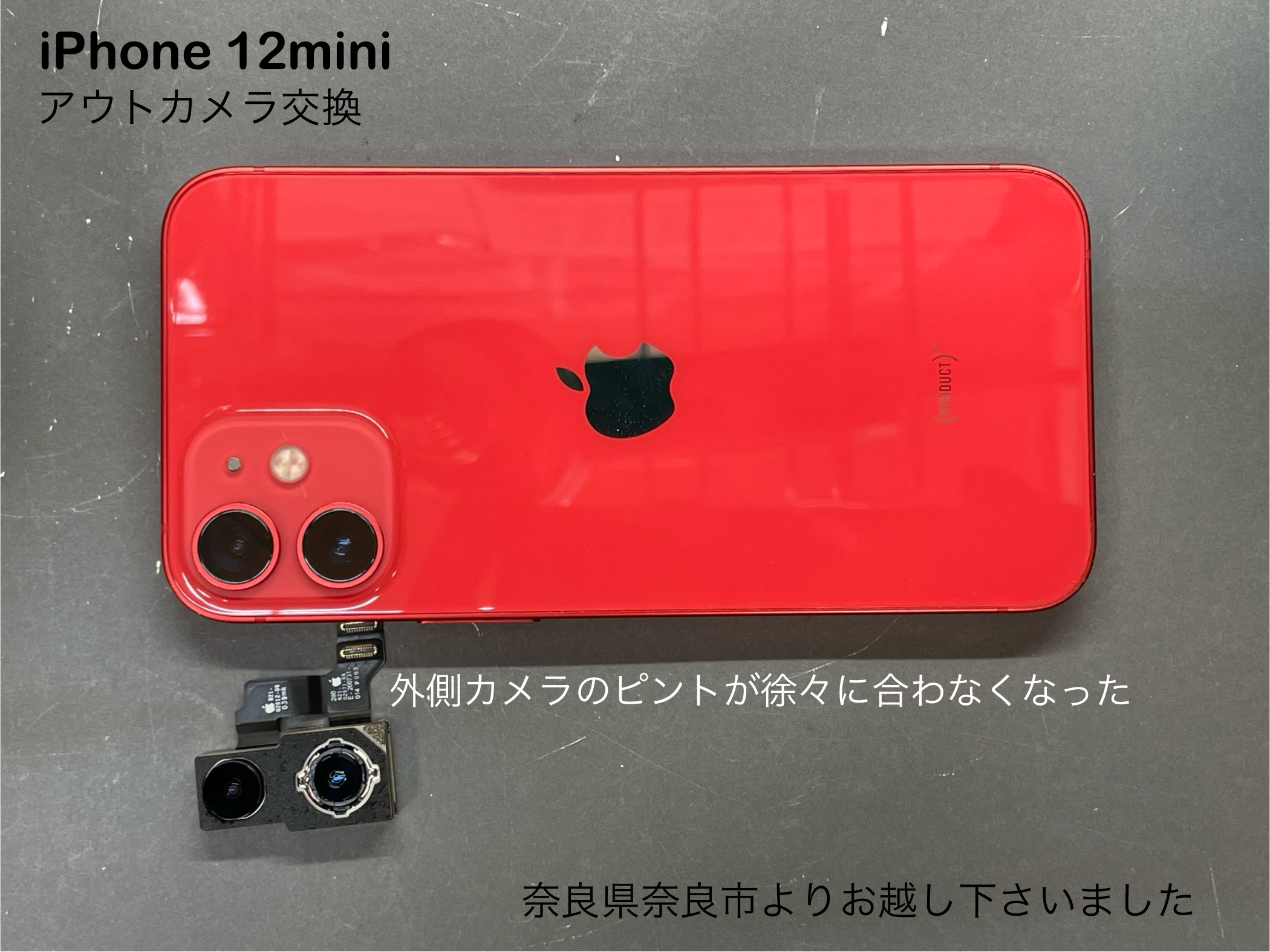 今回のiPhone 修理は奈良県奈良市よりお越しのお客様よりiPhone 12miniのアウトカメラ交換のご依頼を頂きました。