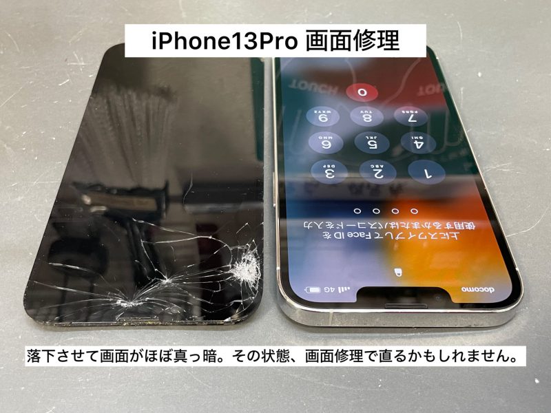 iPhone 13 Proの画面が割れた!奈良市西新在家町からご来店下さいました。安価にiPhone修理をお考えなら、ならファミリー1階カメラアサヒへ!