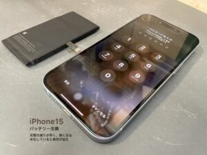 夏場に携帯が熱くなる場合の熱の原因を断定することは難しく、今回のバッテリーの膨張と充電の減りが、複数原因の絡んでいる症状なのかが分解前には点検できないのですが、お客様にはご了承いただき、バッテリー交換でお預かりしました。