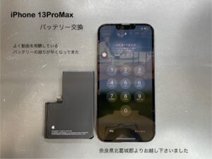 今回ご紹介させて頂きます、iPhone修理は奈良県北葛城郡からお越しのお客様よりiPhone 13ProMaxのバッテリー交換のご依頼です。
