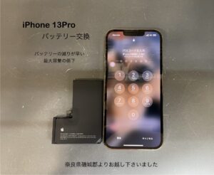 今回ご紹介させて頂きます、iPhone修理は奈良県磯城郡からお越しのお客様よりiPhone 13Proのバッテリー交換のご依頼です。