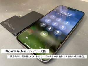 今回ご紹介するのは、iPhone14ProMaxのバッテリー交換です。生駒からご来店下さいました。