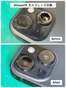 今回ご紹介するのは、iPhone15のカメラレンズ交換修理。木津川からご来店下さいました。ご自宅から近い所で修理ができそうとご来店下さいました。
