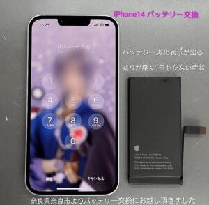 iPhone14「バッテリーが減りが早い・バッテリー劣化表示が出ている」症状で奈良県奈良市よりバッテリー交換にお越しくださいました。