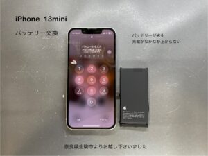 今回ご紹介させて頂きます、iPhone修理は奈良県生駒市からお越しのお客様よりiPhone 13miniのバッテリー交換のご依頼です。