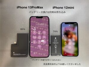 今回ご紹介させて頂きます、iPhone修理は奈良県奈良市からお越しのお客様よりiPhone 13Pro Max、12miniのバッテリー交換を2台分同時にお持ち込み頂きました。