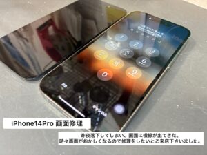 iPhone14Proを落下させてしまい画面がおかしくなったと奈良市内よりご来店。画面修理で直るかもしれませんので、iPhone修理をご検討の方、一度ならファミリー1階カメラアサヒまでご来店下さい。