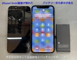 iPhone13mini画面修理とバッテリー交換に奈良県生駒市よりお越しくださいました。