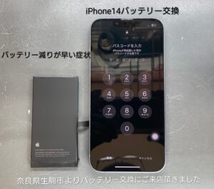 iPhone14バッテリーの減りが早い症状でバッテリー交換にお越しくださいました。