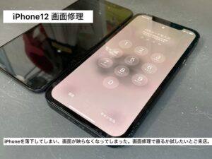 iPhone12を落下させてしまい画面が映らなくなったと木津川よりご来店。画面修理で直るかもしれませんので、iPhone修理をご検討の方、一度ならファミリー1階カメラアサヒまでご来店下さい。