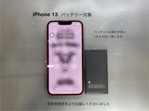 今回ご紹介させて頂きます、iPhone修理は奈良県奈良市からお越しのお客様よりiPhone 13のバッテリー交換のご依頼です。