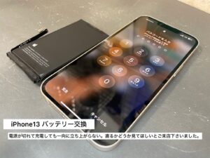 電源が入らないとiPhone13のバッテリー交換を承りました。iPhone修理を試してみたい方、一度ならファミリー1階カメラアサヒまでご来店下さい。