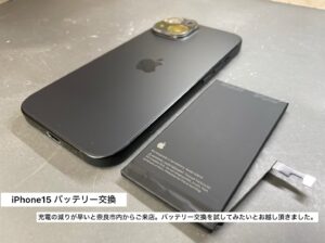 iPhone15のバッテリー交換をしてみたいと奈良市内よりご来店下さいました。iPhone修理の事なら一度カメラアサヒにご相談下さい!