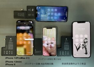 ご家族様それぞれお使いのiPhone 12ProMaxを2台、iPhone 13mini、iPhone Xをそれぞれ1台ずつをお預かりし、バッテリーが劣化し最大容量がかなり低下している。熱くなる事もある…とお話しを伺いました。