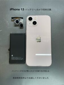 今回ご紹介させて頂きます、iPhone修理は奈良県奈良市からお越しのお客様よりiPhone 13 のバッテリーとカメラ同時交換のご依頼です。