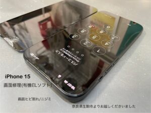 今回ご紹介させて頂きます、iPhone修理は奈良県生駒市からお越しのお客様よりiPhone 15の画面割れ修理のご依頼です。