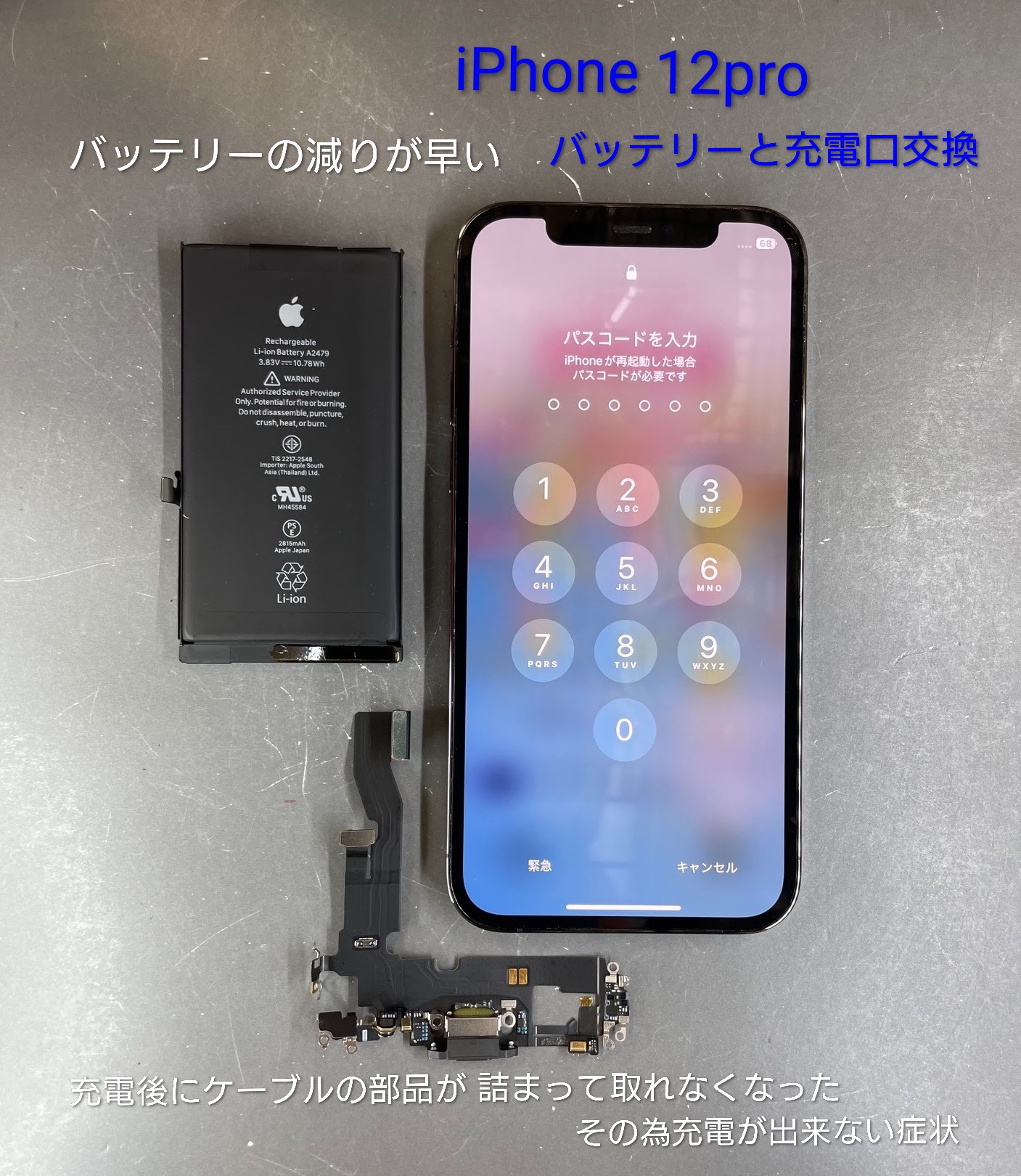 iPhone 12 Pro「バッテリーの減りが早い」「充電してケーブルを抜いた時にケーブルの部品が充電口に刺さったままになって取れなくなった」「充電が出来なくなった」症状でバッテリー交換と充電口交換(ドックコネクター)をさせて頂きました。
