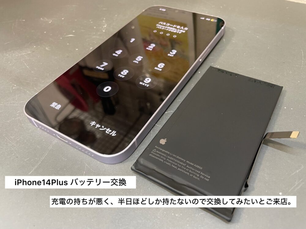 iPhone14Plusのバッテリー持ちが悪いとご来店下さいました。奈良でiPhone修理で直したいなら、ならファミリー1階カメラアサヒにお越し下さい!