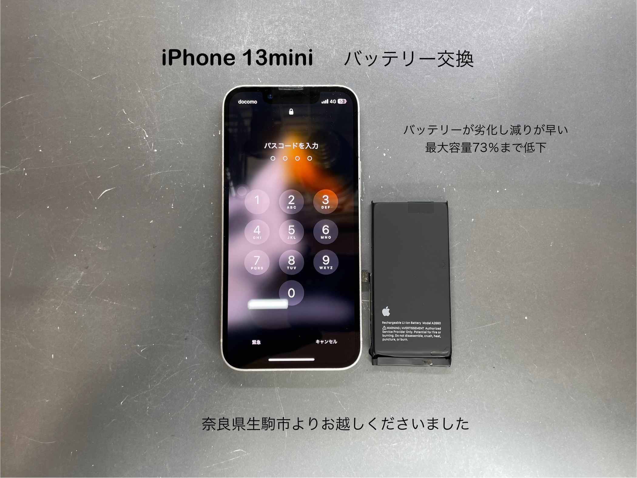 今回ご紹介させて頂きますiPhone 修理は奈良県生駒市からお越しのお客様よりiPhone 13 miniのバッテリー交換のご依頼です。
