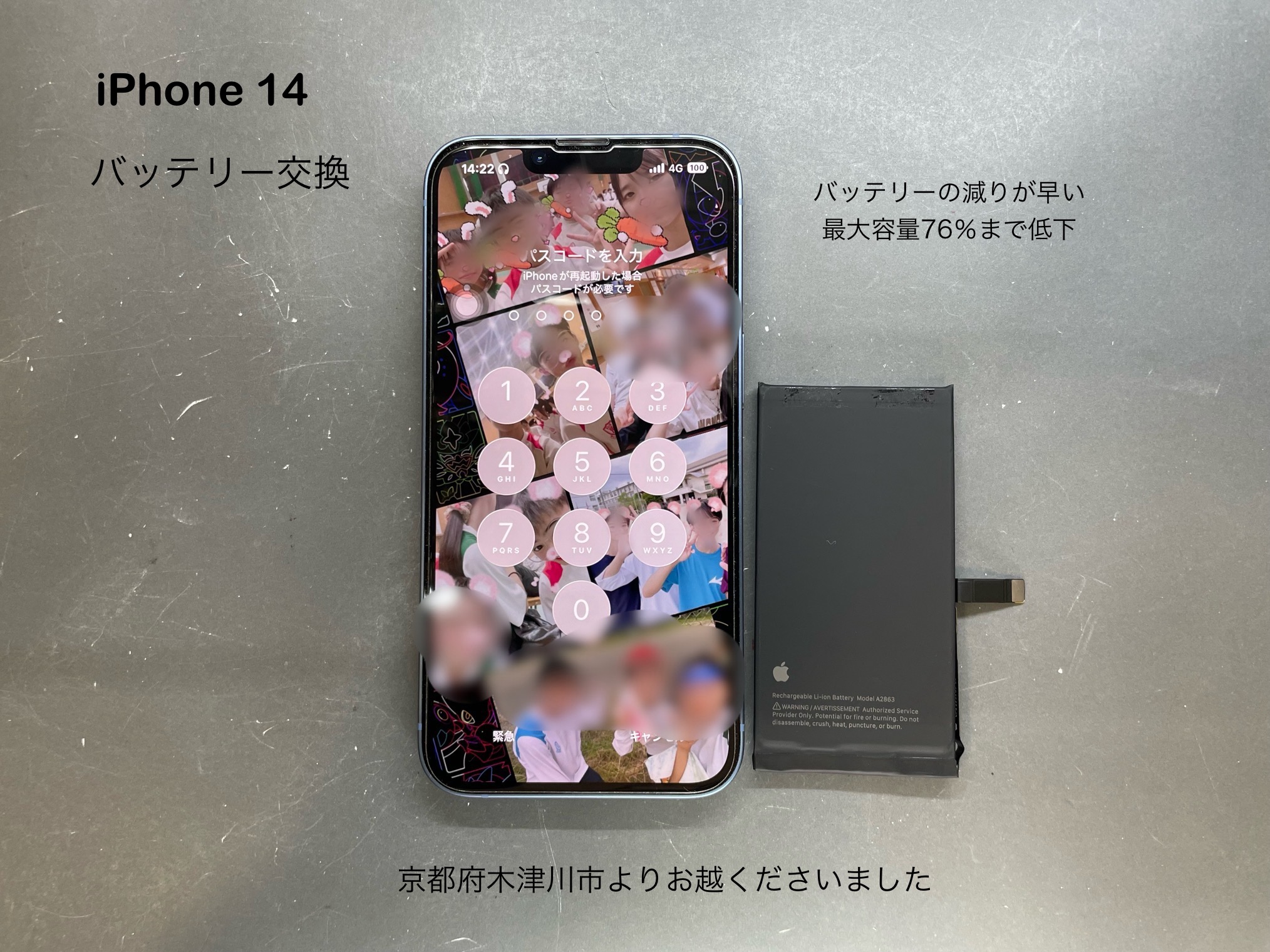 今回ご紹介させて頂きます、iPhone 修理は京都府木津川市からお越しのお客様よりiPhone 14のバッテリー交換のご依頼です。