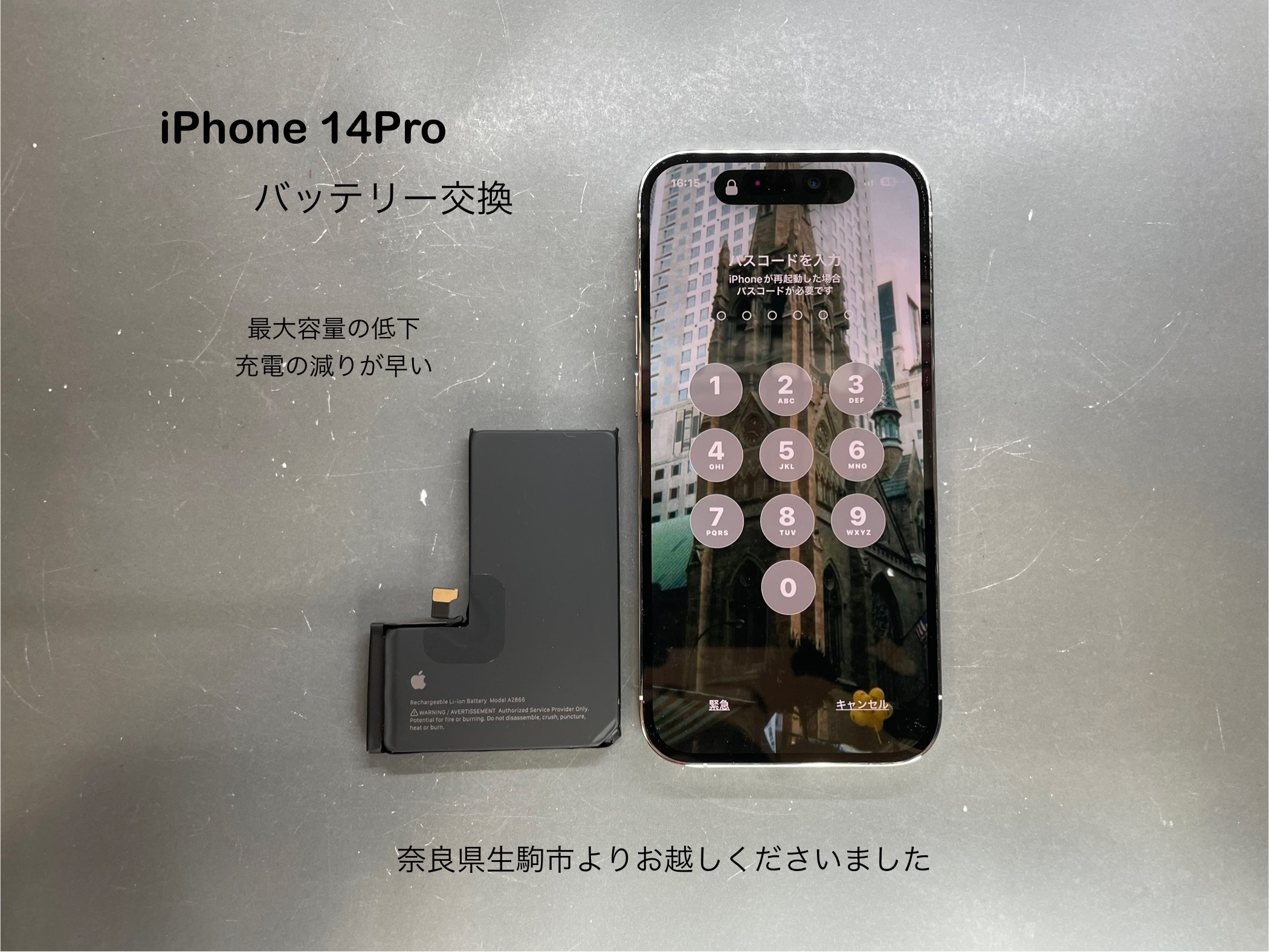 今回ご紹介させて頂きます、iPhone修理は奈良県生駒市からお越しのお客様よりiPhone 14 Proのバッテリー交換のご依頼です。