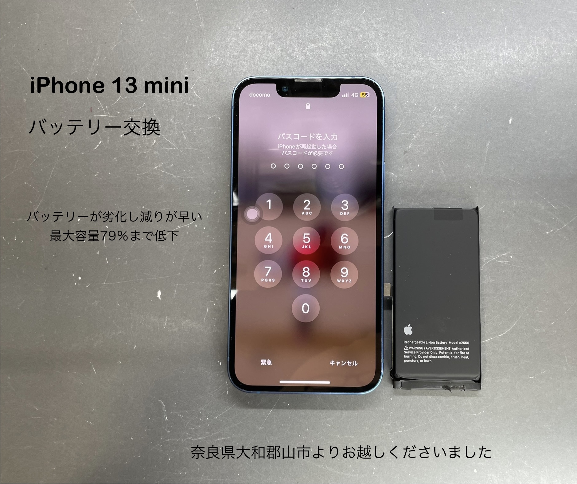 今回ご紹介させて頂きます、iPhone 修理は奈良県大和郡山市からお越しのお客様よりiPhone 13 miniのバッテリー交換のご依頼です。