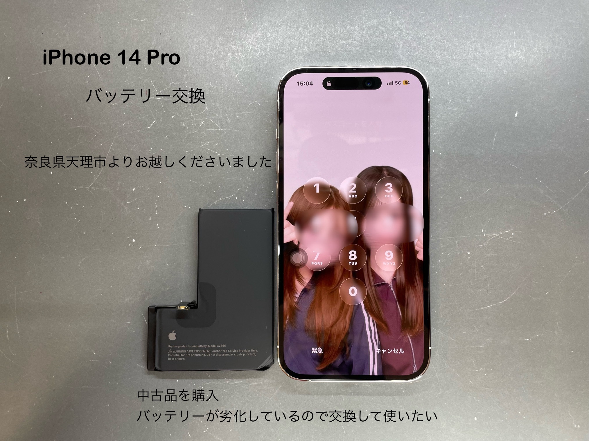 今回ご紹介させて頂きます、iPhone 修理は奈良県天理市からお越しのお客様よりiPhone 14 Pro のバッテリー交換のご依頼です。
