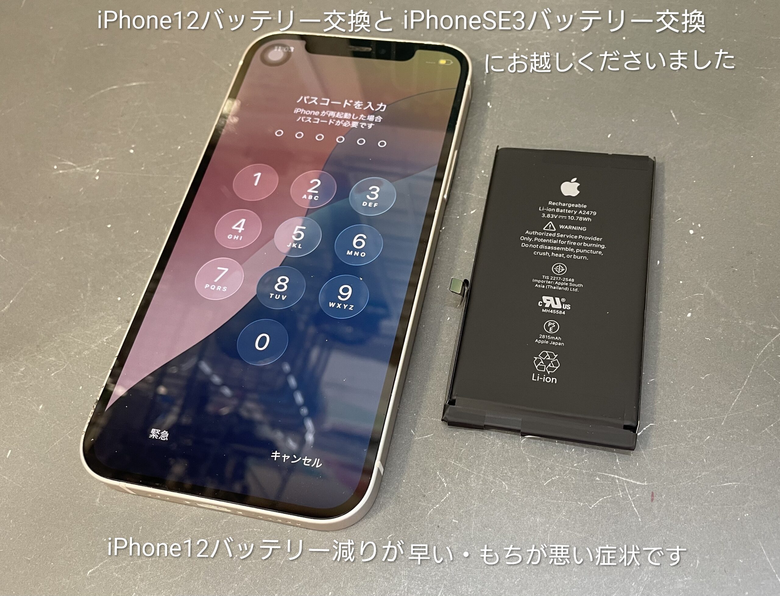 バッテリーの減りが早い・バッテリーのもちが悪い症状はバッテリーの劣化が1番の原因です。iPhone 12とiPhoneSE3の2台バッテリー交換を90分程のお時間を頂き交換させて頂きました。