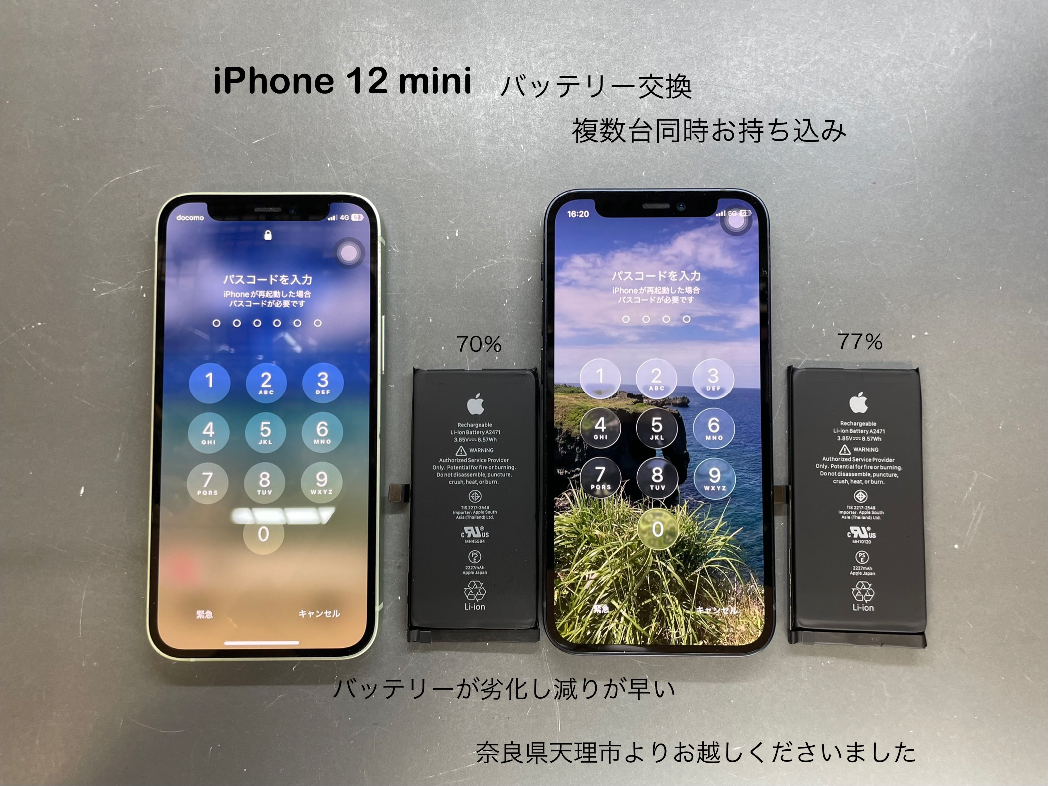 今回ご紹介させて頂きます、iPhone修理は奈良県天理市からお越しのお客様よりiPhone 12 miniのバッテリー交換複数台同時お持ち込みくださいました。