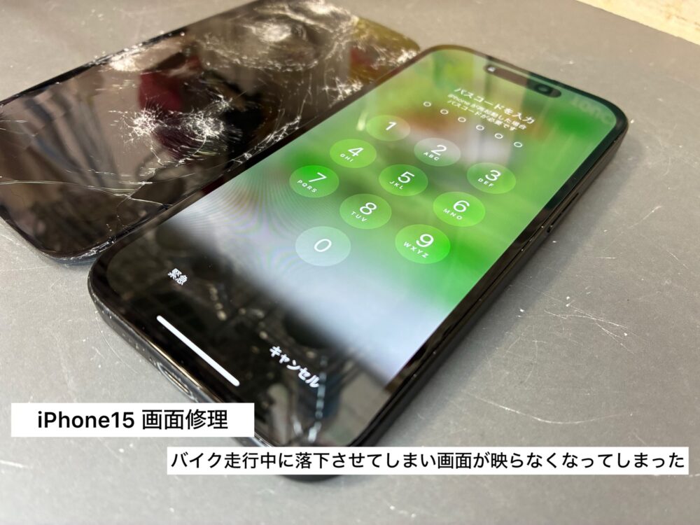 「バイクに乗っている時に iPhone15 を落としてしまって、拾い上げたら画面が粉々に割れていて、まったく映らなくなっていました…」