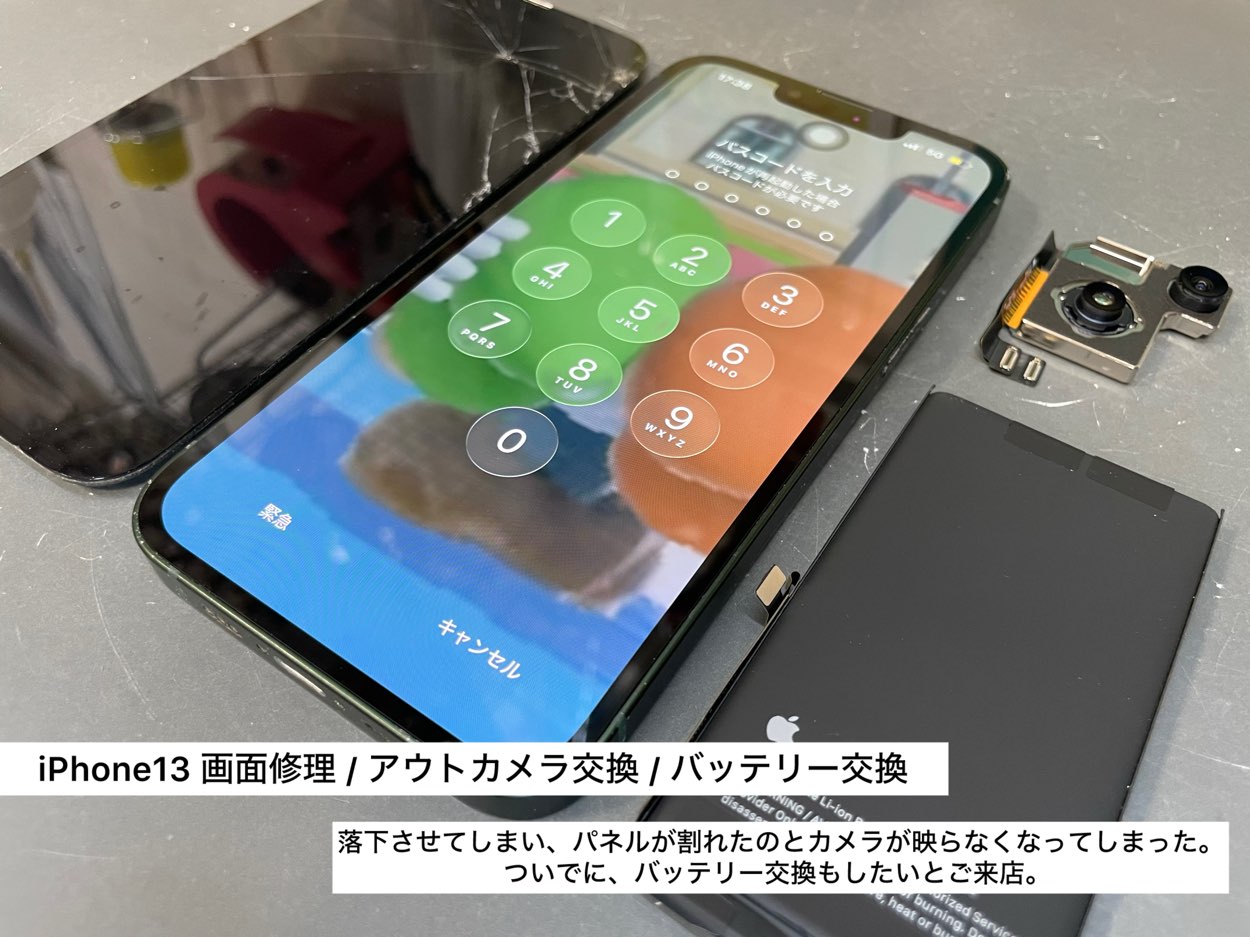 今回は、天理市からご来店くださったお客様の、iPhone13「画面修理+アウトカメラ交換+バッテリー交換」まとめて修理の事例をご紹介します。