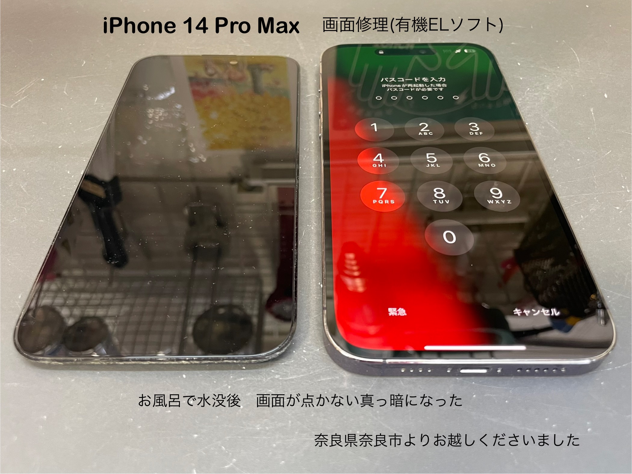 今回ご紹介させて頂きます、iPhone修理は奈良県奈良市からお越しのお客様よりiPhone 14 Pro Maxの画面修理のご依頼です。
