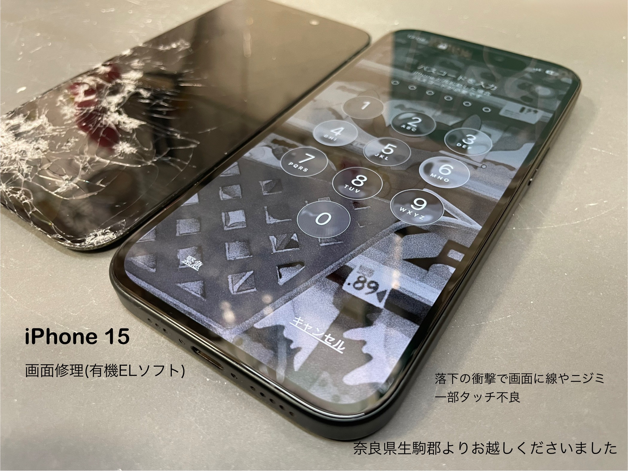 今回ご紹介させて頂きます、iPhone修理は奈良県生駒郡よりお越しのお客様よりiPhone 15の画面修理のご依頼です。
