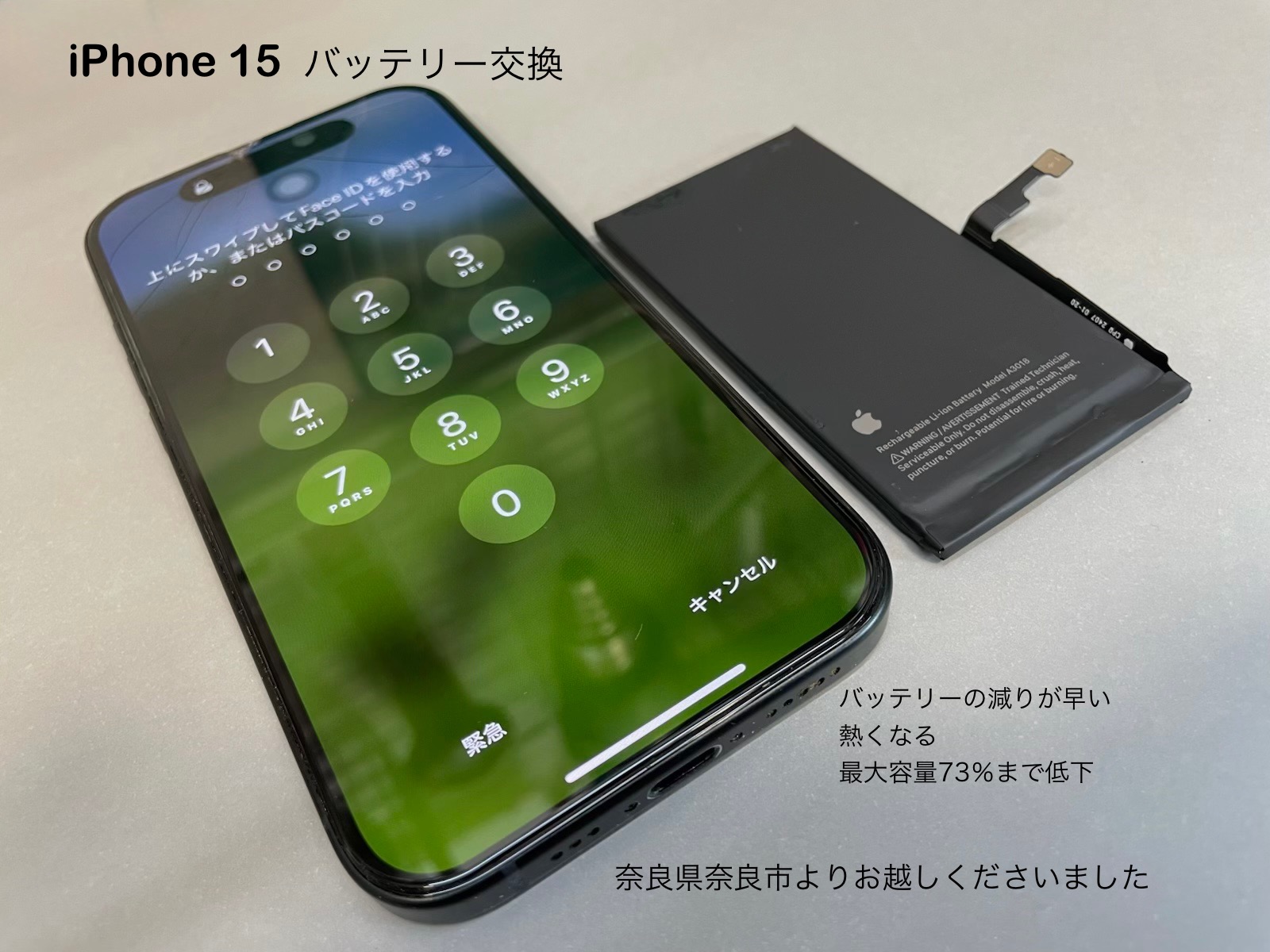 今回ご紹介させて頂きます、iPhone修理は奈良県奈良市からお越しのお客様よりiPhone 15のバッテリー交換のご依頼です。