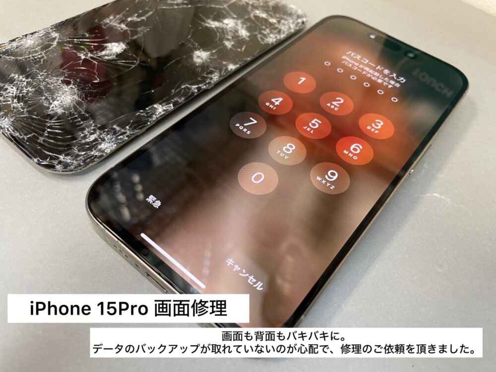 奈良市西千代ヶ丘からご来店|iPhone15 Pro画面修理で写真データを守れたケース【画面・背面バキバキ】
