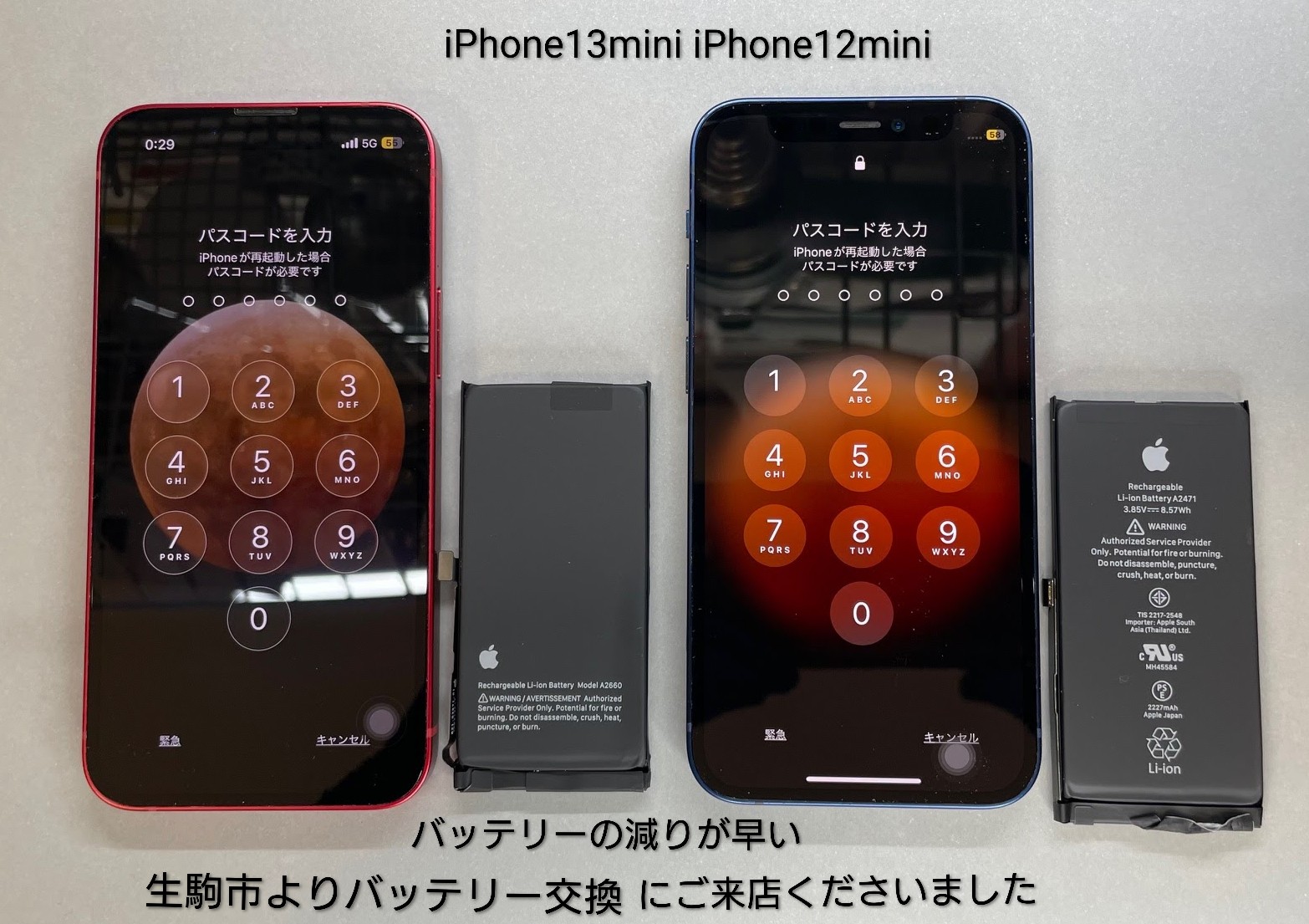 生駒市よりiPhone 12 miniとiPhone 13 miniのバッテリー交換にご来店くださいました。